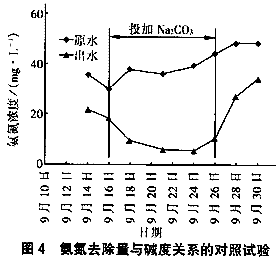 按照生活污水中有40mg/L氨氮被氧化成NO3-(堿度/氨氮=8.85)來(lái)計(jì)算,好氧反應(yīng)區(qū)內(nèi)硝化反應(yīng)正常進(jìn)行需要堿度為354 mg/L(以CaCO3計(jì)),而進(jìn)入好氧段的污水中堿度平均為210mg/L,可見(jiàn)原水經(jīng)過(guò)缺氧段處理后堿度不能滿(mǎn)足硝化反應(yīng)的需要,理論上生活污水中需要投加144mg/L的CaCO3(相當(dāng)于153mg/L的Na2CO3)。當(dāng)回流比為200%時(shí)投加Na2CO3以滿(mǎn)足堿度需求的前后對(duì)照試驗(yàn)見(jiàn)圖4。