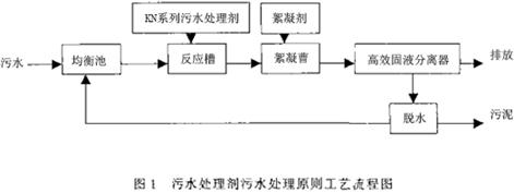 污水在進(jìn)人均衡池前根據(jù)污水的質(zhì)可進(jìn)行格渣、沉淀等處理。在這里高效固液分離器為自我研制,可強(qiáng)化渣液分離,減少占地面積。其它如均衡池、反應(yīng)槽、絮凝槽、脫水設(shè)備均為污水處理中常用成熟設(shè)備。KN污水處理劑以粉狀加入,作用時(shí)間2~3min,絮凝劑以液態(tài)形式加人。作用時(shí)間1~2min渣液分離時(shí),渣的沉降速度可達(dá)到1.5~20mm/s。