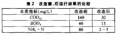 上例中純氧曝氣系統(tǒng)的硬件投資費用約為3萬馬克,而采用供氧能力相當(dāng)?shù)谋砥卦O(shè)備,則投資高達(dá)20萬馬克;應(yīng)用BIOX工藝僅改造投資就比傳統(tǒng)工藝(包括擴(kuò)大曝氣池容積所需的土建費用)節(jié)約800萬馬克,改造后污水處理廠的年運行費用約為l2萬馬克,改造前、后運行結(jié)果的比較見表2。