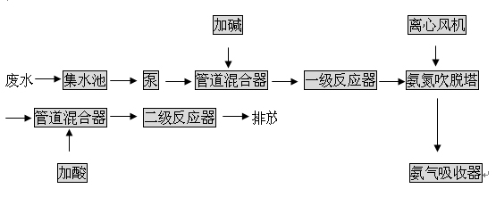 從環(huán)保局監(jiān)測水質(zhì)報(bào)告來看,污水中的主要超標(biāo)污染物指標(biāo)為氨氮、硫化物、和總氰化物,且此類污水的可生化性較差(主要是化學(xué)需氧量較低和氨氮含量較高)。根據(jù)以上情況和我廠多年在處理此類污水工程中的經(jīng)驗(yàn),處理此類污水的關(guān)鍵在污水的預(yù)處理上。因此在設(shè)計(jì)污水預(yù)處理工藝流程中采用氨氮吹脫工藝,確保污水除氨氮的徹底性(預(yù)計(jì)處理出水氨氮含量≤60mg/l)。工藝流程為污水經(jīng)過沉淀處理后,由泵提升至氨氮吹脫塔,進(jìn)氨氮吹脫塔前先調(diào)整污水的PH值在10~12之間,以便于氨氮的吹脫。污水進(jìn)入氨氮吹脫塔后由吹脫塔上部的淋水裝置進(jìn)行均勻布水,水沿吹脫塔中的填料呈液膜狀流下,與下部離心風(fēng)機(jī)送入的空氣接觸,這時(shí)在污水呈堿性條件下,氨從液相向氣相傳質(zhì)轉(zhuǎn)移,實(shí)際上是吸收的逆過程,即解吸。氨隨空氣帶出氨氮吹脫塔后用酸液吸收即可,而除去氨氮的污水再經(jīng)中和后排放。