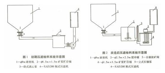 為了改變這樣的生產(chǎn)工藝。我國很多的礦場都開始使用圖2這樣的系統(tǒng)。在濃密機放礦到壓濾機之前加一個緩沖桶加上攪拌。這樣大大減少了濃密機中上層漿料跑混的現(xiàn)象。放礦更加穩(wěn)定。把臥式離心泵改成液下長軸泵。優(yōu)化了原來的工作狀況: