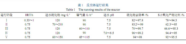 流化床連續(xù)進水4d后,載體表面開始有生物膜生長,此后15d內(nèi),反應器的水力停留時間(HRT)從3.7h降低到1h,進水硫化物(S2-)從50mg·L-1提高到120mg·L-1,進水COD控制在250~300mg·L-1之間,曝氣量從75L·h-1提高到90L·h-1,進水pH控制在7.5~8.5之間。反應器運行到第19d時,HRT為1h,COD和硫化物負荷分別為7.5kg·m-3·d-1和3.0kg·m-3·d-1,去除率分別為78.3%和92.62%,出水為乳白色渾濁狀,生成了膠體狀的單質(zhì)硫顆粒,出水pH升高0.5左右。同時,根據(jù)顯微鏡觀察,發(fā)現(xiàn)生物膜結(jié)構由絲狀菌和菌膠團組成,微生物相對比較豐富,說明生物膜馴化成功。從第20d起反應器正常運行,開始正式試驗。試驗廢水溫度為18~21℃,進水COD確定為350mg·L-1左右。試驗分為五個階段,第Ⅰ階段研究HRT對生物氧化廢水中硫化物的影響,第Ⅱ階段研究進水硫化物濃度的改變對反應器處理效果的影響,第Ⅲ階段研究不同曝氣量對反應器處理效果的影響,第Ⅳ階段研究進水pH的改變對反應器處理效果的影響,第Ⅴ階段研究進水硫化物濃度和曝氣量對反應器運行效果的綜合影響。Ⅰ~Ⅳ階段各歷時12d,第Ⅴ階段歷時20d。反應器整體運行情況見表1。