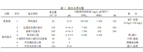 江西某生化有限公司以生產(chǎn)赤霉素為主,該公司在生產(chǎn)過(guò)程中產(chǎn)生的廢水主要來(lái)自提煉的溶媒萃取余液和板框過(guò)濾、超納濾膜的洗滌廢液。其主要的污染物及指標(biāo)見(jiàn)表1。