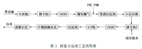 綜合廢水與經(jīng)過(guò)預(yù)處理的萃取廢水在調(diào)節(jié)池2中充分混合后進(jìn)入后續(xù)的常規(guī)處理單元,經(jīng)過(guò)UASB2,A/O池,豎流式沉淀池,生物接觸氧化池,斜板沉淀池后達(dá)標(biāo)排放。