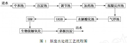 該公司原廢水處理工藝采用化學(xué)混凝和生物處理聯(lián)合工藝。其主要構(gòu)筑物有:中和池、沉淀池、調(diào)節(jié)池、加藥池、混凝池、氣浮池、水解酸化池、UASB、SBR、生物接觸氧化、斜板沉淀池。其工藝流程如圖1所示。