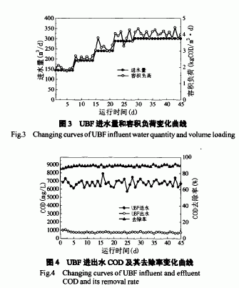 由圖3可知,UBF進(jìn)水量由150m3/d提高至300m3/d,容積負(fù)荷也從平均2kgCOD/m d,提高至4.1kgCOD/m d,達(dá)到了設(shè)計(jì)要求,啟動(dòng)期歷時(shí)35d。較原有工程啟動(dòng)期歷時(shí)半年,啟動(dòng)時(shí)間大為縮短。啟動(dòng)初始負(fù)荷的選擇是系統(tǒng)順利啟動(dòng)的關(guān)鍵,雖然接種污泥經(jīng)過(guò)馴化,并含有一定量的顆粒污泥,但由于接種污泥量較少,若初始負(fù)荷過(guò)高,容易造成反應(yīng)器揮發(fā)酸積累,污泥流失,直至啟動(dòng)失敗。經(jīng)過(guò)多次實(shí)驗(yàn)證明2kgCOD/m d,的初始負(fù)荷對(duì)于本實(shí)驗(yàn)所接種的污泥量是合適的。啟動(dòng)時(shí)容積負(fù)荷有波動(dòng),并沒(méi)有對(duì)啟動(dòng)過(guò)程造成很大影響。