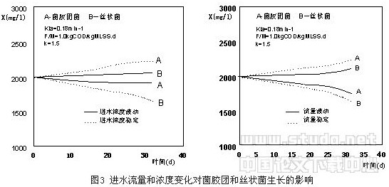 實際的污水處理廠負荷是變化的,實驗發(fā)現(xiàn)在停留時間3、4和5h.下,系統(tǒng)的溶解氧濃度分別為1.2,2.2和3.0mg/l。圖3是流量和基質增加幅度為1.5倍采用計算機模擬結果。在穩(wěn)定的流量和濃度條件下,長期運行是菌膠團細菌占優(yōu)勢。流量或是基質濃度的變化會造成絲狀菌的過度生長,而絲狀菌的生長不是一簡單的可逆過程,結果會造成了污泥沉降性能的變化。值得說明的是上述結果是在相對高的負荷下的模擬結果,研究表明對低負荷結果相反。