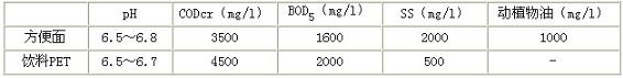 廢水來源為:方便面生產(chǎn)廢水:100 m3/d;飲料(PET)生產(chǎn)廢水:300 m3/d;員工生活污水:150 m3/d。設(shè)計廢水水量為600m3/d。