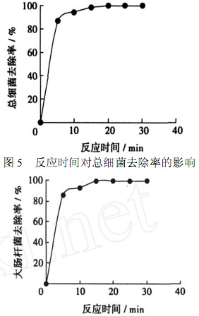 4) 在常溫下隨著反應(yīng)時(shí)間的增加 ,總細(xì)菌的去除率可以達(dá)到99. 9 % ,并且在20 min后達(dá)到排放標(biāo)準(zhǔn);同時(shí)大腸桿菌的去除率 30 min 后達(dá)到最大值99. 3 %。