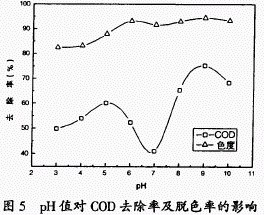 3.2 印染廢水pH值對(duì)處理效果的影響。將100mL印染廢水的pH用鹽酸和氫氧化鈉調(diào)至310的范圍,分別投加1g經(jīng)420~C焙燒改性的凹凸棒土進(jìn)行振蕩吸附實(shí)驗(yàn),其COD及色度去除率隨pH值的變化見(jiàn)圖5。