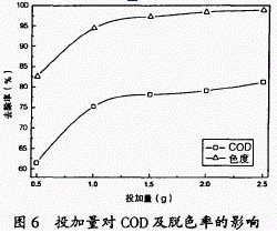 由圖5可知,在中性條件下,改性凹土對(duì)COD處理效果較差;當(dāng)印染廢水呈酸性或堿性時(shí),改性凹凸棒土對(duì)印染廢水COD有較好的去除效果。在堿性條件下脫色和脫除COD效果比酸性條件好;當(dāng)pH值為9時(shí),印染廢水的COD去除效果及脫色效果均較好,廢水中COD去除率為75.3%,色度去除率為94.5%。而該廢水本身pH值為8.5,所以綜合考慮,pH值為8.5~9.5時(shí)是用凹土處理堿性n¨印染廢水的較適宜條件。如果印染廢水本身為酸性,可以考慮將pH調(diào)節(jié)至6左右可能更合理。色度的變化雖然有與COD變化相似的趨勢(shì),但pH為7時(shí)色度去除率并沒(méi)有明顯下降。這也再次說(shuō)明凹凸棒土對(duì)COD的去除和色度去除機(jī)理可能完全不同[12],色度去除可能僅是簡(jiǎn)單的表面物理吸附,而COD的去除還涉及到化學(xué)吸附,所以對(duì)pH的變化比較敏感,其吸附機(jī)理值得進(jìn)一步深入研究。