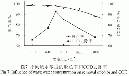 保持電源電流為0.2A(電極有效面積為12cm)2, 占空比為0.4,脈沖頻率為0.2kHz不變,對不同濃度的廢水處理60min,實驗結(jié)果如圖7。由圖7可見,脫 色率隨濃度的升高而逐漸降低;COD去除率隨濃度的升高先增加后減小,在500mg/L時達到最大值。廢水在低濃度時色度去除率很高而COD去除率較低, 這是由于在電絮凝的同時,有大量水分子發(fā)生了分解所致。