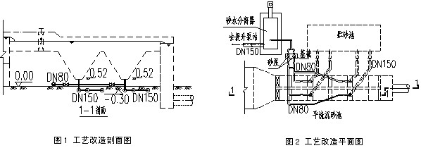 后來經(jīng)在現(xiàn)場(chǎng)查看和對(duì)照施工圖比較時(shí)注意到排砂管從砂斗底部出來尚有約400mm排砂鋼管處于地面以上,考慮用比氏旋流沉砂池除砂方式除砂,從其出地面的立管上接出排砂管,為了保證砂粒能夠從沉砂池砂斗中提升到砂水分離器,在管道上設(shè)兩臺(tái)砂泵,砂水分離器出水流回格柵間,砂粒同脫水污泥一起外運(yùn),貯砂池備用,便產(chǎn)生了下面的最終方案。