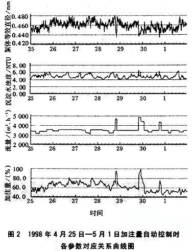 確定適當(dāng)?shù)幕炷齽┘幼⒘,關(guān)鍵是要找出一個滯后時間較短,而與沉淀水濁度相關(guān)性又較好的參量作為目標值來控制。