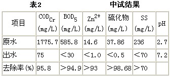 ② 廢水在鐵屑過濾塔中反應(yīng),停留30min左右后,出水Zn2+的含量<0.05mg/L,硫化物的含量<0.5mg/L,這充分說明了鐵屑過濾完全滿足本工藝對(duì)Zn2+和硫化物的治理要求。