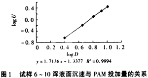 于是可以推測U0與D有相關(guān)性。而高濁度水混凝渾液面沉速不僅與含沙量有關(guān),而且與顆粒因素有關(guān)。用UO可以部分地表征高濁度水的顆粒因素(從表1也可反映出來),從而在實際處理一定組成的高濁度水時可以借助試驗得到的經(jīng)驗關(guān)系,根據(jù)渾液面自然沉速以及所期望達到的渾液面沉速來確定PAM的投藥量。