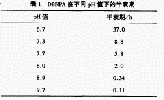 DBNPA的水溶液在酸性條件下比較穩(wěn)定。在堿性條件下容易水解,提高pH值,其水解速度加快,DBNPA在不同pH值下的半衰期見表1[5]。DBNPA在自然水體中依次降解為2一溴一3一次氮基丙酰胺、氰乙酰胺、丙二酸,最終降解為溴離子和二氧化碳。此降解過程所產(chǎn)生的中間產(chǎn)物及最終產(chǎn)物毒性均符合有關(guān)的環(huán)境標(biāo)準(zhǔn),對(duì)水質(zhì)無污染。加熱、紫外線和熒光照射都可以使其分解速度大大加快。此外,日光及土壤微生物也能讓DBNPA分解成為無害的物質(zhì)。