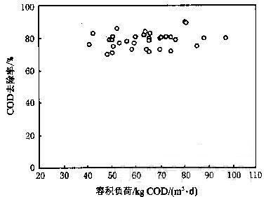 | 圖2 容積負(fù)荷與COD去除率的關(guān)系 |