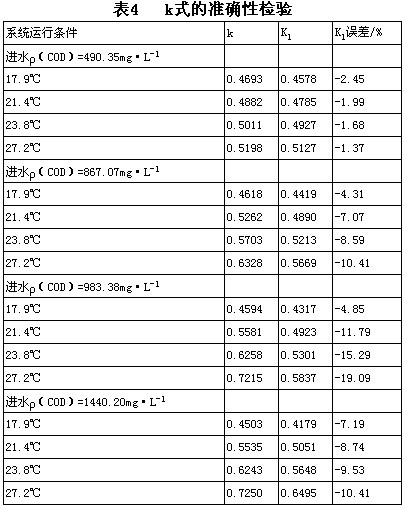 將4個(gè)進(jìn)水COD的質(zhì)量濃度:490.35,867.07,983.38和1440.20mg/L,依次代入冬季k與Yo的關(guān)系式k=-0.000 02 Yo+0.479 1,可估算出4個(gè)k,依次是:0.469 3,0.461 8,0.459 4和0.450 3 d-1。同理,將上述4個(gè)進(jìn)水COD值代入夏季k與Yo的關(guān)系式k=0.000 3Yo+0.372 7,求出4個(gè)相應(yīng)的k,依次是:0.519 8,0.632 8,0.721 5和0.725 0d-1。