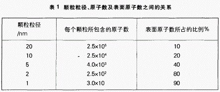 4.表面效應(yīng)。表面效應(yīng)是納米粒子及固體材料中重要的效應(yīng)之一,是指表面原子數(shù)隨納米結(jié)構(gòu)尺寸減小而急劇增大后引起的性質(zhì)上的變化。表1是顆粒粒徑、原子數(shù)及表面原子數(shù)之間的關(guān)系。表面原子數(shù)的增加、原子配位的不足,必然導(dǎo)致納米結(jié)構(gòu)存在許多表面缺陷,使表面具有很高的活性,極不穩(wěn)定,很容易與其他原子結(jié)合。納米顆粒的粒徑極小,具有巨大的比表面積的表面自由能。