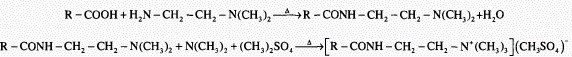 腐植酸為天然高分子化合物,在其結(jié)構(gòu)單元中含有多種官能團,其中羧基含量隨產(chǎn)地不同,其中區(qū)別很大,一般在5~9mmol/g之間[2],以江西的為好。改性時,可利用羧基與有機胺作用,生成功能酰胺基,然后再進行胺甲基化和季銨化,即可向分子中引入季銨離子。反應(yīng)式如下: