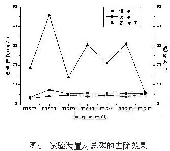 試驗(yàn)裝置對總磷有一定的去除效果。試驗(yàn)裝置進(jìn)、出水總磷濃度及其去除率如圖4所示,由圖可見進(jìn)水總磷濃度為3.57mg/L~7.42mg/L,出水總磷濃度為2.90mg/L~5.22mg/L,出水總磷濃度均值為4.16mg/L,去除率為7~46%,平均去除率為25%。污水中磷有三種形態(tài):有機(jī)磷酸鹽、聚磷酸鹽和正磷酸鹽,由于在北小河污水處理廠常規(guī)好氧生物處理過程中,大多數(shù)有機(jī)磷和聚合磷轉(zhuǎn)化為正磷酸鹽,因此二沉池出水中所含有的磷大多數(shù)是溶解性的[1]。而在二沉池出水里加藥,通過混凝,化學(xué)藥劑與磷反應(yīng)生成不溶性磷酸鹽,然后通過沉淀、粗濾和微孔濾膜的截留與吸附作用使磷得以部分去除。