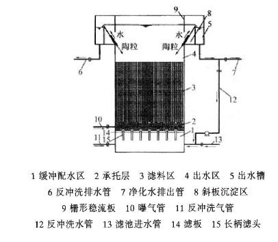 氣水比0.5~1;反沖洗周期為7 ~ 8d,氣水聯(lián)合反沖洗,氣、水反沖洗強(qiáng)度均為5一8sL/(s*m2)、反沖洗時(shí)間為15一18 min;水力負(fù)荷1.05 ~ 2.5rn3/ ( m2?h)。