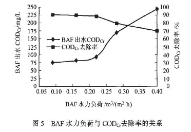 水力負(fù)荷的大小直接關(guān)系到污水在反應(yīng)器中與載體生物膜的接觸時(shí)間.其值越小污水與生物膜反應(yīng)時(shí)間愈長(zhǎng),效果愈好。進(jìn)水CODCr濃度為820mg/L時(shí),BAF在不同水力負(fù)荷下對(duì)焦化廢水中CODcr的去除效果見(jiàn)圖5。由圖5可見(jiàn)BAF對(duì)焦化廢水中的有機(jī)物有較高的去除率,當(dāng)水力負(fù)荷為0.05一0.2 m3/(m2"h)時(shí),COD。去除率可達(dá)90%以上,出水CODcr濃度約為220 mg/L,達(dá)到GB13456-92國(guó)家二級(jí)排放標(biāo)準(zhǔn)。