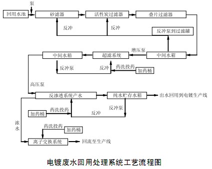針對(duì)要將達(dá)到排放標(biāo)準(zhǔn)的電鍍廢水處理至可作為電鍍工藝用水的水質(zhì),回用處理系統(tǒng)采用了膜分離技術(shù),該系統(tǒng)的工藝流程如下圖所示。