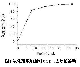 從上圖1可以看出,加入了氧化劑,CODCr的值反而增加了,并且隨著氧化劑用量的增加,CODCr值逐漸增加。這是因?yàn)镹aClO使染料分子的偶氮鍵斷裂,原來的大分子變成小分子,有利于K2Cr2O7的氧化從而使CODCr增高;從上圖2可以看出,加入了氧化劑,色度的去除率即顯著提高,并且隨著氧化劑用量的增加,色度的去除率逐漸增加,但當(dāng)氧化劑的量達(dá)24 mL以后時,色度的去除率基本不再增加。
