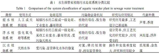 凡生長在水中或濕土壤中的植物,以大型的草本植物為主,包括水生、濕生和沼生植物,稱為水生植物(hydrophyte)[5]。水生植物主要包括3大類:水生維管束植物、水生蘚類和高等藻類。在污水治理中應用較多的是水生維管束植物,它具有發(fā)達的機械組織,植物個體比較高大,可分為挺水、浮水和沉水3種生活型[6],這3種類型的水生植物在污水處理系統(tǒng)中存在一些不同的應用方式,詳見(表1)。