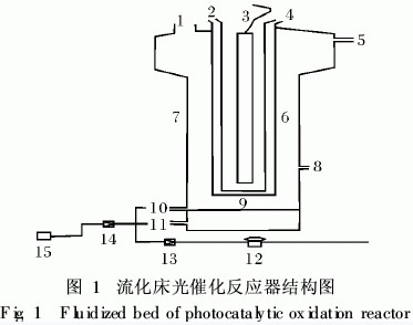 1.加料口,排氣口;2.冷凝水進口;3.高壓汞燈;4.冷凝水出口; 5.出水口;6.石英冷肼;7.反應(yīng)瓶;8.取樣口;9.曝氣板;10.進水口; 11.進氣口;12.泵;13.液體流量計;14.氣體流量計;15.空壓機