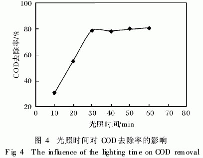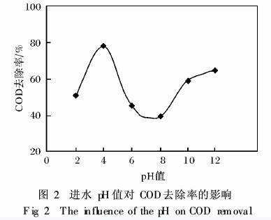 由圖2可知,進水pH在4時, COD去除率較 高,達到80%。這是由于在酸性條件下,一方面,帶 正電的催化劑表面有利于光生電子向催化劑表面的 遷移,與表面吸附的電子受體O2(ads)反應(yīng)生成 O2-,抑制光生載流子的復(fù)合;另一方面,也有利于 體系中帶負電荷的有機分子向催化劑表面遷移和吸 附,使反應(yīng)速率提高。在接近中性時, COD去除率 較低,因為顆粒大小、表面負荷、TiO2能帶位置都受 pH的強烈影響,且跟TiO2在純水中等電點在6左 右有關(guān)。