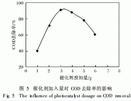 由圖5可知,當催化劑的投加量2 g/500 mL 時,COD去除率較低;隨著催化劑用量增加,COD去除率逐漸增加,但當催化劑用量增加到大于3g/500 mL后,COD去除率則略有下降。這種現(xiàn)象表明,催化劑用量少時,有效光子不能完全轉(zhuǎn)化為化 學(xué)能,反應(yīng)速率較低;通過適當增加催化劑的濃度能提高紫外光的利用率,形成更多的電子-空穴對, 增加了反應(yīng)活性位數(shù)量,產(chǎn)生出更多的活性物 質(zhì)[8],從而加快了降解速度。但當催化劑濃度增加到一定程度后,光子能量已得到了充分的利用,繼續(xù) 增加催化劑濃度,只會引起溶液渾濁度增加,影響光的透過率,導(dǎo)致光子效率降低,降低反應(yīng)速度。本實驗催化劑最佳投加量為3. 0 g/500 mL。同時可以查看中國污水處理工程網(wǎng)更多技術(shù)文檔。
