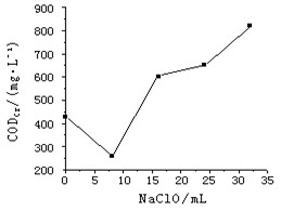 將盛有100mL水樣的燒杯放置磁力攪拌器上,加入一定量的NaClO,調節(jié)溶液的pH,反應一定時間后,取水樣測定其CODCr和色度[1],計算二者的去除率。然后使該水樣通過活性炭固定床,并對流出液進行CODCr和色度的測定。因水樣中含有較多Cl-,采用CIC-100離子色譜儀測出Cl-的具體濃度,根據(jù)該濃度配制NaCl溶液,測其CODCr,通過差量法即可得出CODCr的真實值。