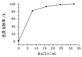 100mL水樣,pH=6,反應時間=25min。改變氧化劑(2.5%的NaClO溶液,以下相同)的量,結果見圖1和圖2。