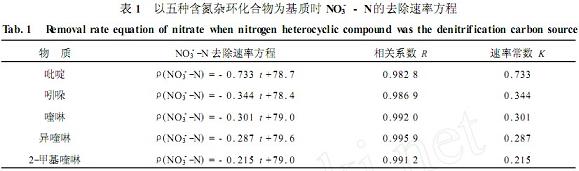 (2)以上述五種雜環(huán)有機(jī)物作為單一基質(zhì)時(shí),反硝化速率與進(jìn)水硝態(tài)氮的質(zhì)量濃度無關(guān),反硝化反應(yīng)為零級(jí)反應(yīng)。