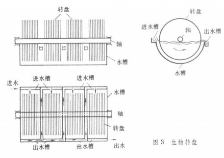 ② 生物轉(zhuǎn)盤(圖3)。由固定在一橫軸上的若干間距很近的圓盤組成。圓盤面生長有一層生物膜,作用與生物濾池中濾料相似。圓盤是用輕質(zhì)耐腐蝕、堅固而不易撓折的材料,如泡沫聚氯乙烯、泡沫聚苯乙烯、硬聚氯乙烯、玻璃鋼等材料制成。圓盤有約一半的面積浸在一個半圓形或矩形的水槽內(nèi)。廢水在槽中流過時,圓盤緩慢轉(zhuǎn)動。圓盤的一部分浸入廢水時,生物膜吸附廢水中的有機物,使微生物獲得營養(yǎng)。當(dāng)轉(zhuǎn)出水面時,生物膜又從大氣中直接吸收氧氣。如此循環(huán)反復(fù),廢水中的有機物在需氧微生物的作用下得到氧化分解。圓盤上的生物膜也會因老化不斷地自行脫落,隨水流出,在二次沉淀池中沉淀下來。生物轉(zhuǎn)盤能處理高濃度廢水,而不會發(fā)生堵塞現(xiàn)象。構(gòu)造與生物轉(zhuǎn)盤類似的還有生物轉(zhuǎn)筒。主體裝置是由固定在一橫軸上的若干圓筒組成,圓筒中裝填料,生物膜生長在填料表面。