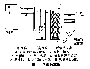 貯水箱與平衡水箱用鋼板制成,容積分別為300L和50L。厭氧和好氧生化池尺寸均為16cm×16cm×64cm(有效容積為16.3L)。斜板二沉池容積為8.5L,斜板的安裝角度為70°,生化池和二沉池用有機(jī)玻璃加工而成。