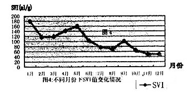 污泥沉降比與污泥濃度的對應(yīng)關(guān)系,主要因SVI值的改變而發(fā)生變化,SVI值大小的改變,除受生物增長期和一些偶然因素影響外,溫度是影響SVI值大小的主要因素。下圖為一年四季中不同月份下所對應(yīng)的SVI值情況。