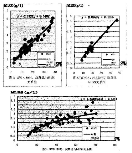 以上三圖及對應(yīng)關(guān)系式表明:當(dāng)SVI<120時(shí),污泥沉降比與MLSS呈線性關(guān)系,其中,當(dāng)SVI<80時(shí),MLSS值隨污泥沉降比變化的斜率比80<SVI<120時(shí)的大,當(dāng)SVI>120時(shí),污泥沉降比與MLSS呈對數(shù)關(guān)系。這說明:當(dāng)SVI值比較穩(wěn)定的情況下,污泥濃度與污泥沉降比之間存在著穩(wěn)定的對應(yīng)關(guān)系。隨著SVI值的階段性增大,污泥濃度隨污泥沉降比變化的幅度越來越小。
