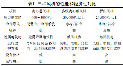 將污泥堆肥工程常用的離心通風(fēng)機(jī)與污水處理工程曝氣系統(tǒng)常用的多級(jí)離心鼓風(fēng)機(jī)、羅茨風(fēng)機(jī)進(jìn)行性能和經(jīng)濟(jì)性對(duì)比見(jiàn)表1。