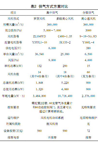 此外,在風(fēng)機(jī)選型中,每小時(shí)數(shù)萬(wàn)立方米風(fēng)量、幾千帕風(fēng)壓的參數(shù)對(duì)于羅茨或離心風(fēng)機(jī)的選型都十分困難,且運(yùn)行工況處于極低效率區(qū)域,裝機(jī)功率大大增加,若選擇大型離心通風(fēng)機(jī),會(huì)由于集中供氣較為復(fù)雜的管路系統(tǒng),使得壓力無(wú)法滿足工藝要求。