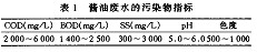 醬油廢水的主要成分包括糧食殘留物、發(fā)酵過程產(chǎn)物、醬油色素、微量洗滌劑、消毒劑、大量的鹽分、各種微生物及微生物的分泌物和代謝產(chǎn)物。廢水具有較高的BOD,COD,SS和色度,廢水BOD5/COD大于0。5,易于生物降解。醬油廢水的主要污染物指標(biāo)如表l所示。