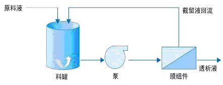 膜分離的基本工藝原理是較為簡(jiǎn)單的(參見(jiàn)下圖)。在過(guò)濾過(guò)程中料液通過(guò)泵的加壓,料液以一定流速沿著濾膜的表面流過(guò),大于膜截留分子量的物質(zhì)分子不透過(guò)膜流回料罐,小于膜截留分子量的物質(zhì)或分子透過(guò)膜,形成透析液。故膜系統(tǒng)都有兩個(gè)出口,一是回流液(濃縮液)出口,另一是透析液出口。在單位時(shí)間(Hr)單位膜面積(m2)透析液流出的量(L)稱為膜通量(LMH),即過(guò)濾速度。影響膜通量的因素有:溫度、壓力、固含量(TDS)、離子濃度、黏度等。