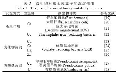 微生物對(duì)重金屬離子的沉淀作用,一般認(rèn)為是由于微生物對(duì)金屬離子的異化還原作用或是由于微生物自身新陳代謝的結(jié)果。一方面,一些微生物可分泌特異的氧化還原酶,催化一些變價(jià)金屬元素發(fā)生氧化還原反應(yīng),或者其代謝產(chǎn)物或細(xì)胞自身的某些還原物直接將毒性強(qiáng)的氧化態(tài)的金屬離子還原為無(wú)毒性或低毒性的離子;另一方面,一些微生物的代謝產(chǎn)物(硫離子、磷酸根離子)與金屬離子發(fā)生沉淀反應(yīng),使有毒有害的金屬元素轉(zhuǎn)化為無(wú)毒或低毒金屬沉淀物(表2)。