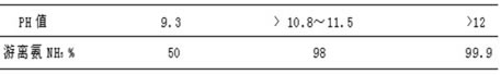 (1) 用石灰乳調(diào)節(jié)pH值在不同值條件下,氣體的存在狀態(tài)也不同,只有以游離的氣體形式存在才能被吹脫,游離NH3與PH值的關(guān)系如下表所示: