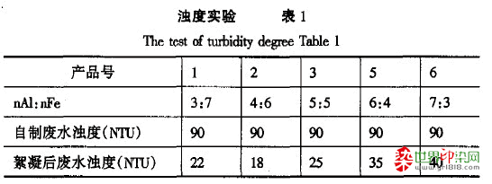 A1/Fe的摩爾比對絮凝性能的影響見表1。從表1可知,PSAFS的絮凝效果在相同劑量范圍內(nèi),當(dāng) 和Fe摩爾比為7:3、4:6、5:5、6:4、7:3時,PsA 絮凝性能的影響,當(dāng)A1/Fe=4:6時,絮凝劑的除濁效果最好,本實驗A1/Fe的摩力比選用4:6。原因是這是因為Fe3 加入后,AP 和Fes 在水解過程中會通過羥基橋連成多核多羥基絡(luò)合物,這種多核多羥基絡(luò)合物具有更強的電中和能力和架橋吸附能力,PSAFC的分子結(jié)構(gòu)呈長鏈枝權(quán)狀聚集態(tài)。隨著鐵離子含量增加,除濁效果加強,樣品的分子鏈長度增加,這一點正好解釋了出現(xiàn)以上現(xiàn)象的原因。但是,隨著鐵含量的繼續(xù)增加,絮凝效果的增加趨緩。