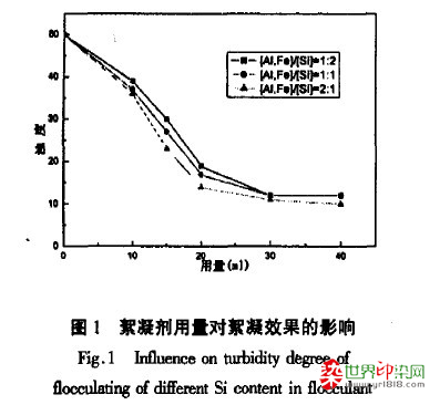 如圖1所示,隨著硅含量的降低,剩余濁度達到最低,而且試驗現(xiàn)象顯示,絮凝的礬花大且沉降速度也是最快。這是因為當(dāng)絮凝劑中硅含量高時,金屬離子含量相對不足,活性硅酸的自身聚合反應(yīng)得不到有效的控制,硅酸聚合速度比較快,這樣絮凝劑投入水中后,金屬離子水解產(chǎn)生的多核羥基離子含量很少,電中和作用很差,不能使水中顆粒物脫穩(wěn),也就不利于黏結(jié)架橋作用的充分發(fā)揮,所以綜合絮凝效果沒有明顯的改善。因此,最佳的[A1,F(xiàn)e]/Si]摩爾比為1:1。