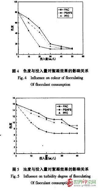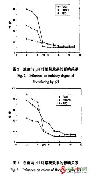 由圖2、圖3可見,PSAFS適用的PH范圍更為廣泛,且在pH>5的情況下,PSAFS對印染廢水的色度和濁度的去除率最高。